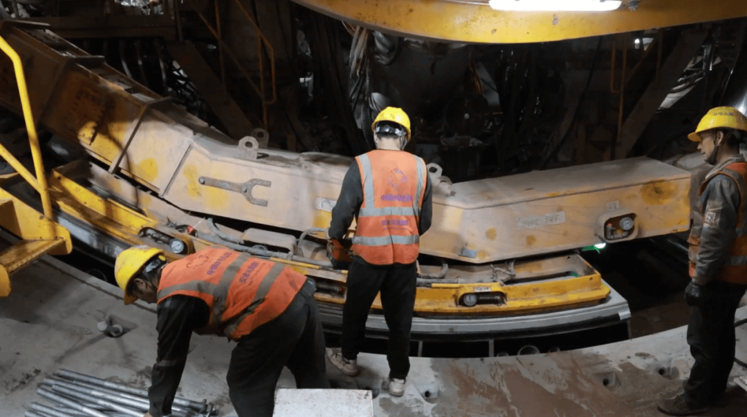 在城西南排工程南段顾家桥港施工现场,机器轰鸣,一片繁忙景象。工人们正在进行管片吊装下井,龙门吊将重达数吨的混凝土预制管片缓缓吊起,精准送入地下深处的隧洞口,随后,工人们迅速展开拼装工作。