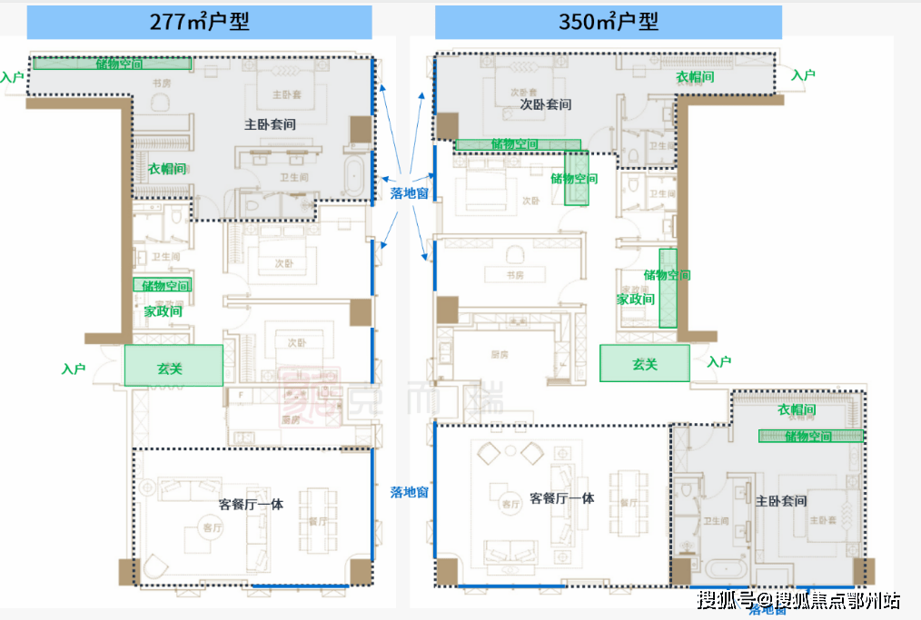 除了采用巨幅落地窗提升视觉效果外,户型出彩之处颇多,部分户型采用双入户U8国际官方网站设计、套间设计(其中350㎡户型实现双套间设计),精妙的设计给产品U8国际官方网站加分。另外户型设计了隐藏储物空间,充分利用空间实现大量收纳储藏,将实用性与尺度感融合。