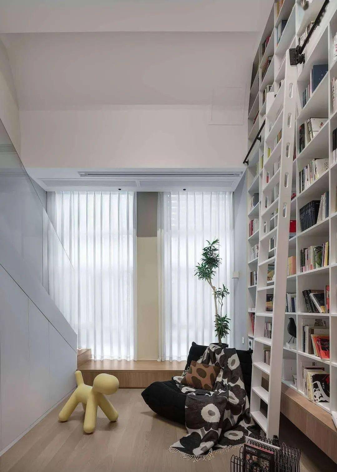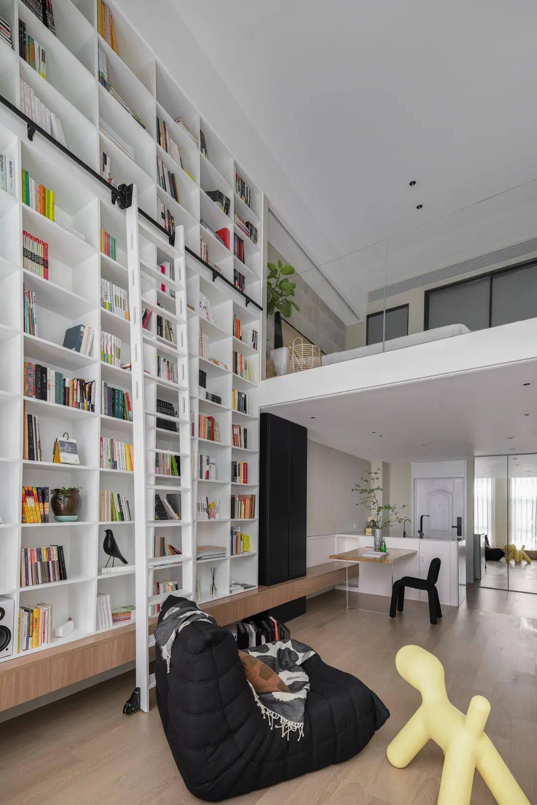 今天齐家小编要分享的是一套35㎡小公寓装修案例,设计师利用层高打造loft结构,超高墙面全部设计成图书馆,带来超大气效果,空间又大又美。