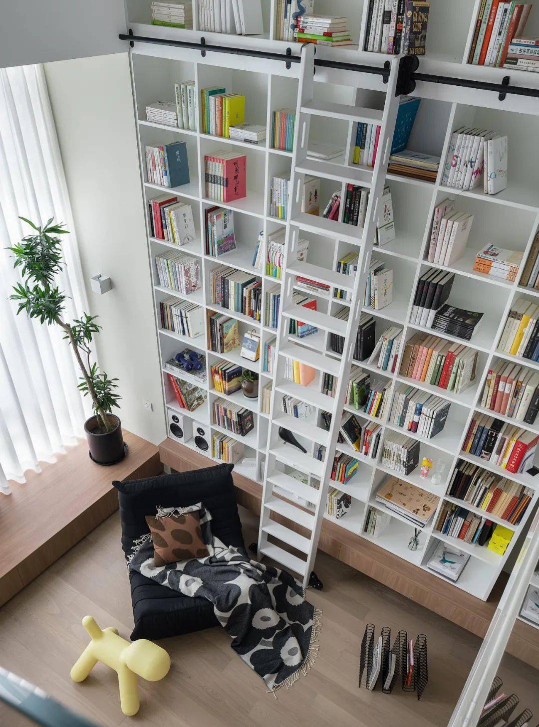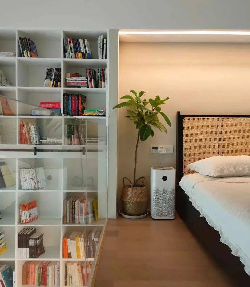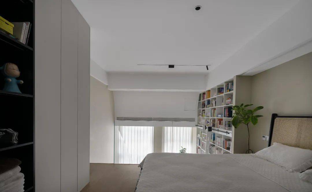 客厅最惊艳的是定制一整面高5m的全敞开式书柜,白色U8国际官方网站背景+各色书封,更有立体感。轨道滑梯的设计方便拿取书籍。