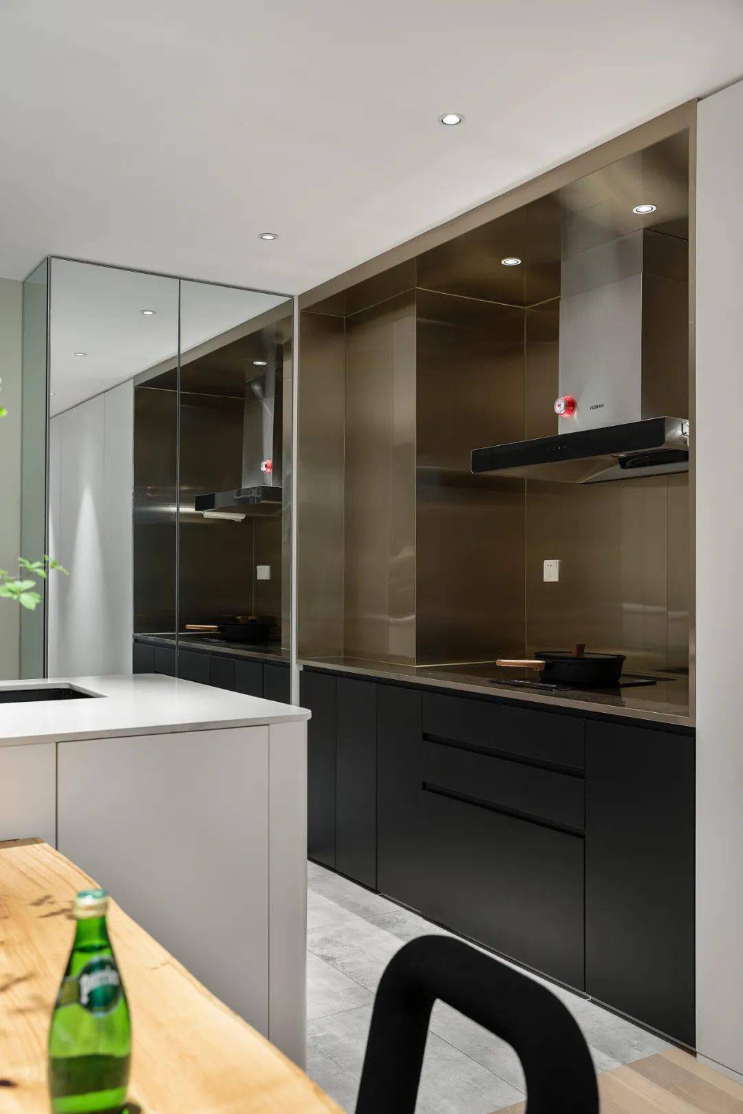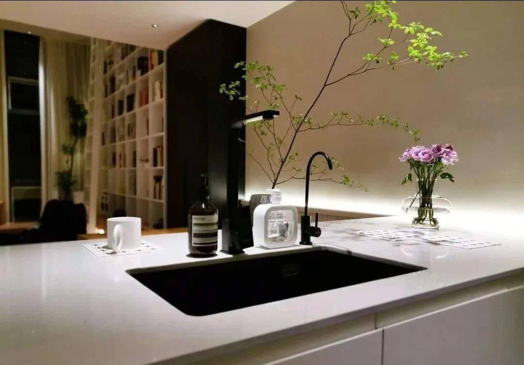 厨房,选用黑色柜体搭配铜色不锈钢,打造一个mini下厨空间。一侧设计了岛台,搭配黑色石英石大单水槽,平时洗菜、切菜、备餐都在这里进行,分担厨房压力。