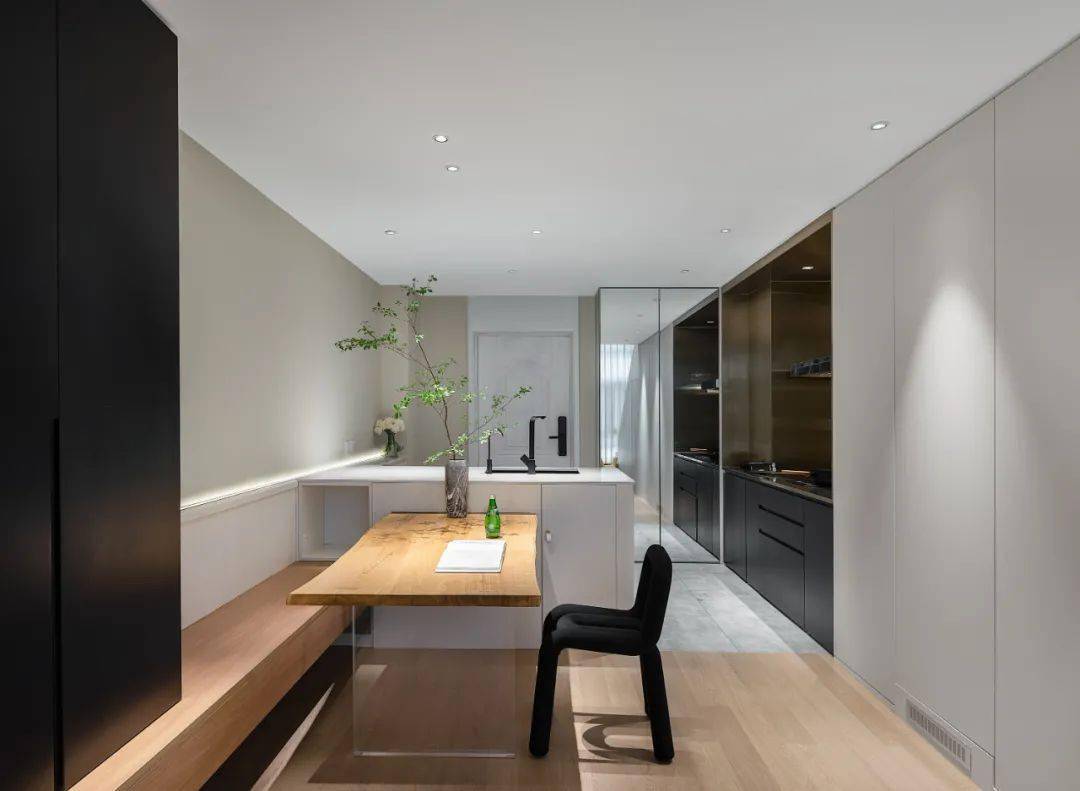 餐厅,岛台连接餐桌,仿佛悬浮在半空中,空间更显轻盈通透。餐桌不仅是吃饭,也是日常办公学习的地方。