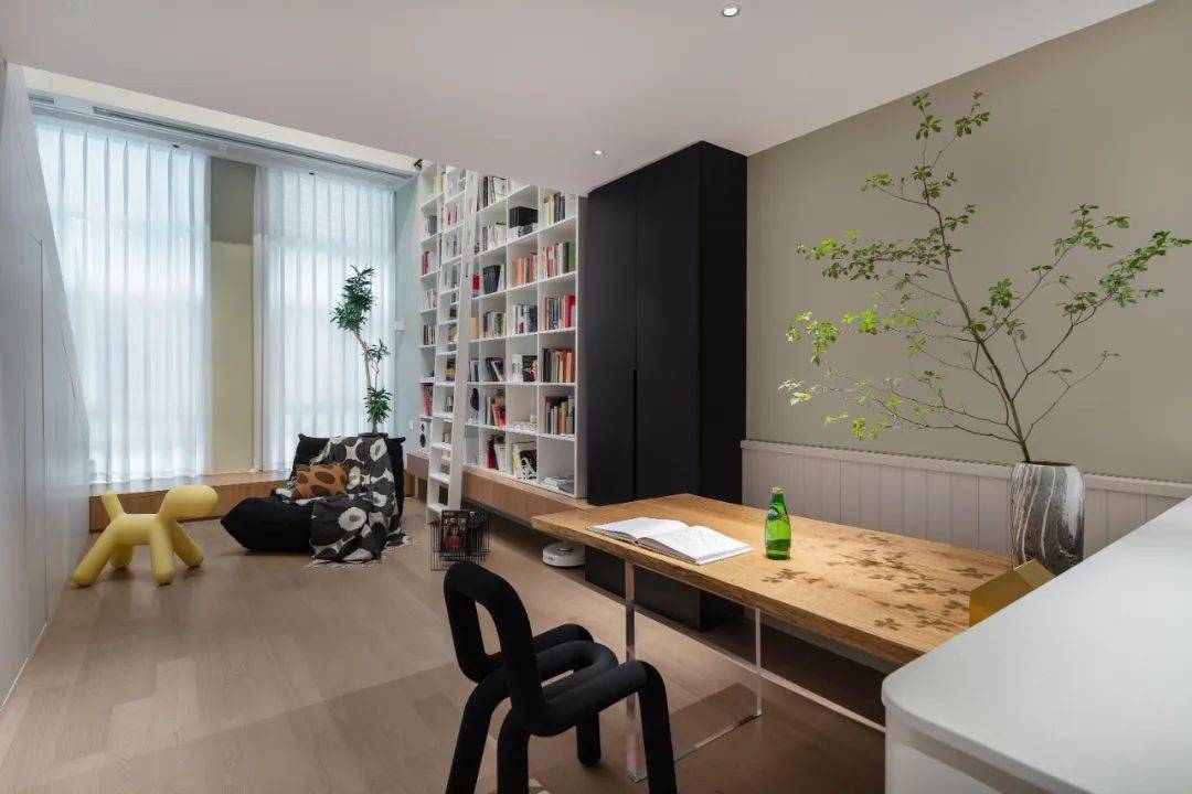 卡座与书桌的连接,让空间拥有一体性和延伸感。将每一块区域自然连接起来,同时增加更多收纳空间。