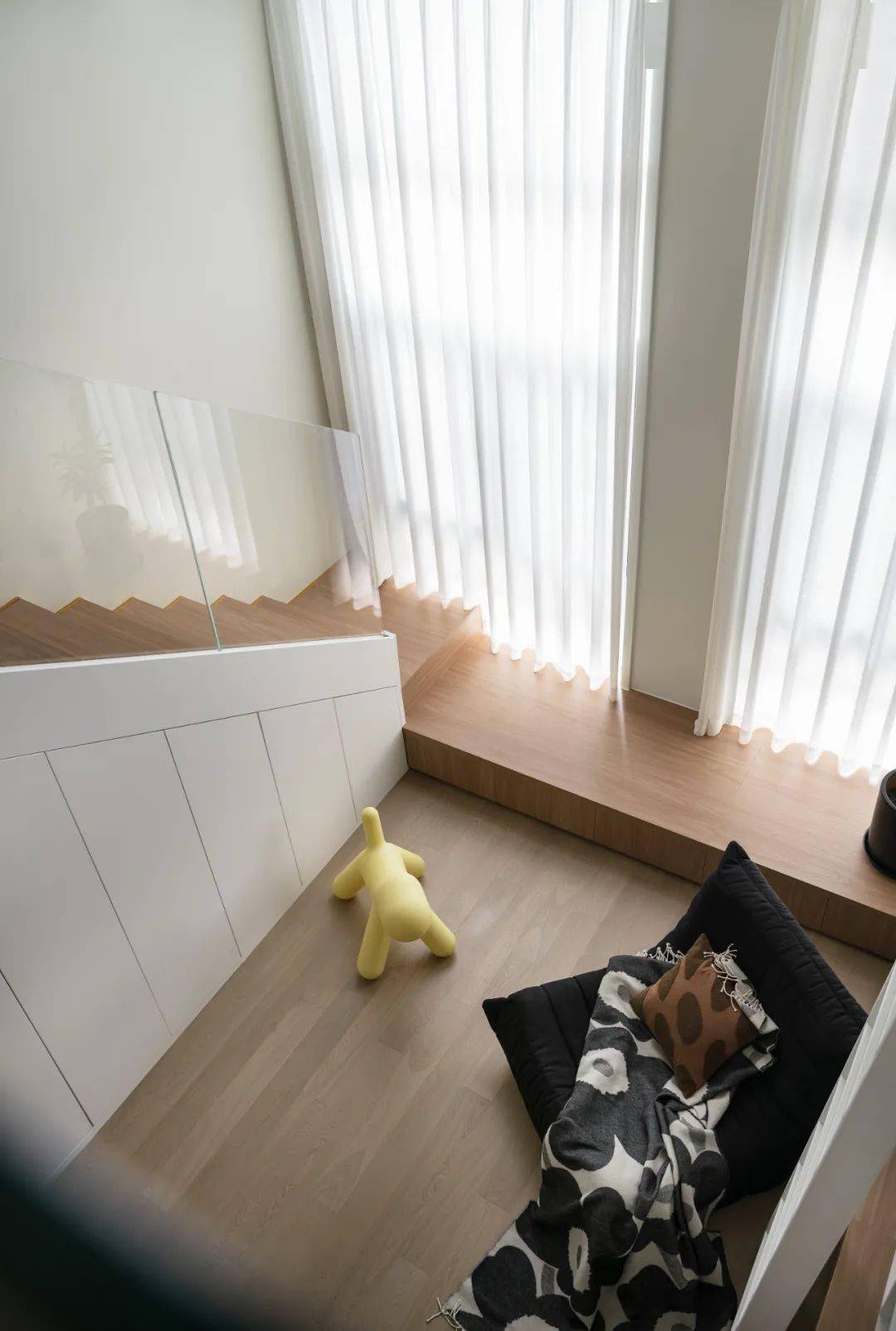 整个空间非常干净清爽,地台U8国际官方网站不仅仅起到楼梯踏步的作用,也可以替代沙发的作用,躺或者坐,都能悠闲自得。