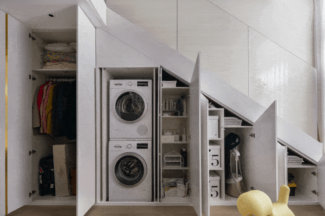 打开柜门,可以看到其中的收纳,暗藏着洗衣机、烘干机和冰箱,甚至过季的衣物和U8国际官方网站家政工具,收纳力赶上一个小型储物间了。