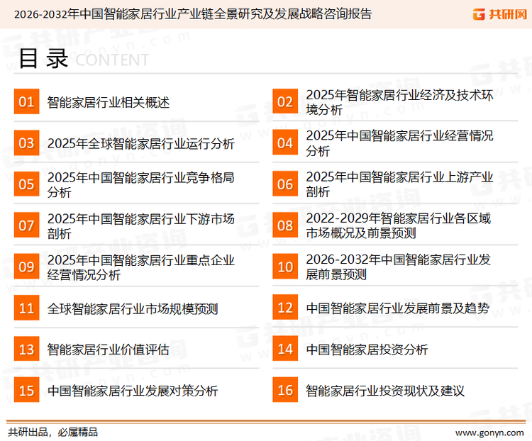 共研网发布的《2026-2032年中国智能家居行业产业链全景研究及发展战略咨询报告》共十章。首先介绍了智能家居行业相关概念以及市场发展环境,接着分析了全球重点区域以及国内智能家居行业市场运行现状,然后介绍了智能家居市场竞争格局、产业链上下游运行态势。随后,报告对智能家居做了重点区域市场以及典型企业经营状况分析,最后分析了智能家居行业发展趋势与投资预测。您若想对智能家居行业有个系统的了解或者想投资智能家居行业,本报告是您不可或缺的重要工具。